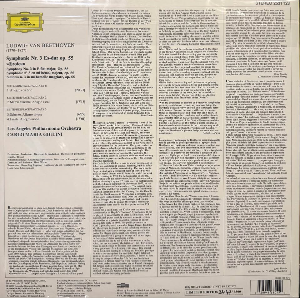 Beethoven began composing his Third Symphony shortly after his increasing deafness and suicidal thoughts became public knowledge. The ‘heroic’ style of this symphony can be interpreted as a musical expression of his triumph over personal suffering. But the symphony also has enormous musical significance: with the ‘Eroica’, Beethoven expanded the symphonic form and thus changed the expectations of a four-part symphony for the next two centuries. Giulini’s recording with Los Angeles Philharmonic Orchestra is highly regarded as reference recording.
